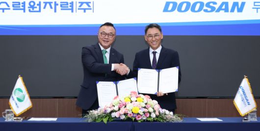 황주호 한국수력원자력 사장(왼쪽)이 20일 서울 방사선보건원에서 정연인 두산에너빌리티 부회장과 영동양수 1·2호기 주기기 공급계약을 체결한 후 기념 촬영을 하고 있다. |