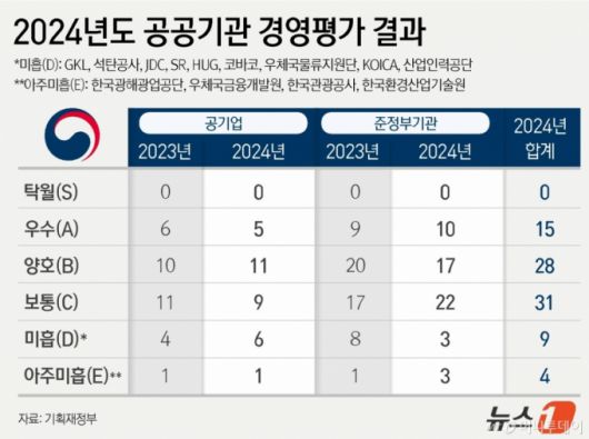 (서울=뉴스1) = 기획재정부는 20일 임기근 2차관 주재로 제6차 공공기관운영위원회(공운위)를 열어 '2024년 공공기관 경영실적 평가 결과 및 후속조치안'을 심의·의결했다. 정부가 87개 공기업 및 준정부기관의 지난해 경영실적을 평가한 결과, 종합등급 우수(A) 15곳, 양호(B) 28곳, 보통(C) 31곳, 미흡(D) 9곳으로 평가됐다. 한국광해광업공단과 한국관광공사 등 4곳은 아주미흡(E)을 받았다. 2년 연속 미흡(D)을 받은 주택도시보증공사의 유병태 사장에 대해서는 해임 건의가 이뤄질 예정이다. |