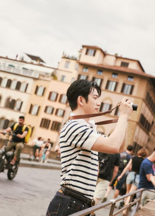 공개된 사진 속 진영은 폰테 베키오(Ponte Vecchio) 일대를 배경으로 모델같은 존재감을 전했다. 무엇보다 눈길을 끈 건 그의 여름 패션이다. 네이비 스트라이프 피케 셔츠에 데님 생지 팬츠를 매치한 진영은 클래식하면서도 감각적인 프렌치 마린 룩을 완성했다.