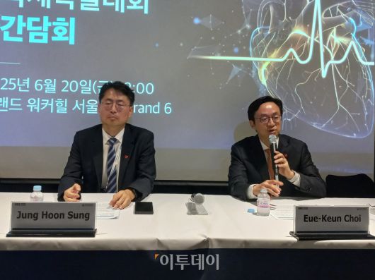 20일 서울 광진구 그랜드워커힐 서울에서 열린 대한부정맥학회 정기국제학술대회 기자간담회에서 성정훈 진료지침이사(분당차병원 심장내과 교수, 왼쪽)와 최의근 학술이사(서울대병원 순환기내과 교수)가 질의응답을 진행하고 있다. |