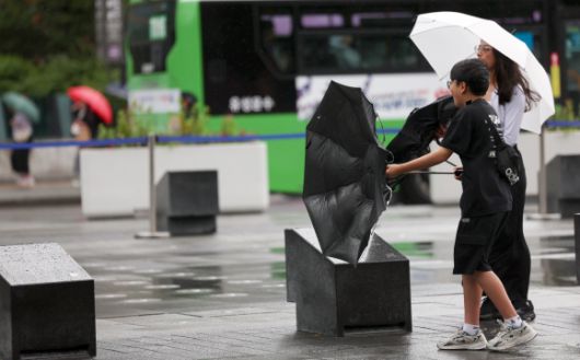 [서울=뉴시스] 조성우 기자 = 장마가 시작된 20일 오전 서울 광화문광장에서 한 시민의 우산이 비바람에 뒤집어 지고 있다. 2025.06.20. 뉴시스 |