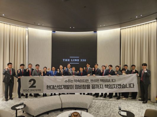 HDC현대산업개발 관계자들이 용산정비창 전면1구역 홍보관에서 책임을 약속하고 있다. HDC현대산업개발 |