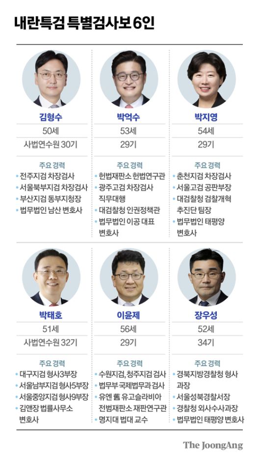특검보 6명 중 5명은 검사 출신이다. 상당수가 특수·공안 수사 경험이 있다. 김형수 특검보는 대전지검·수원지검 특수검사로 재직했다. 박억수 특검보는 서울중앙지검 특수부를 거쳤고 인천지검 부부장검사로 재직하며 공안 사건을 주로 다뤘다. 박지영 특검보도 서울중앙지검 등에서 특수 수사를 했다. 이윤제 특검보 역시 특수검사 경력이 8년이다. 박태호 특검보는 2013년 법무부 공안기획과에 근무했다. 2014년 청와대 민정수석실의 행정관으로 근무한 이력도 있다.