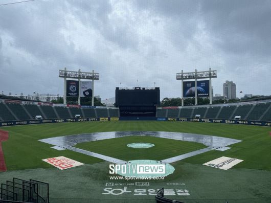 장마 영향을 피하지 못했다. 중부지방은 20일 오전부터 비가 내렸다. 경기 중단이 결정된 시점의 빗줄기는 굵지 않았지만 이미 내린 비의 양이 상당해 방수포 전체가 거대한 물웅덩이로 변해 있었다. 여기에 강한 바람까지 불어왔다.