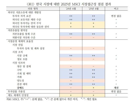 20일 국제금융센터에 따르면, MSCI는 연례 결과 공개에 앞서 전날 발표한 연례 시장 접근성 점검 리뷰에서 한국 증시의 공매도 접근성에 대한 평가를 ‘마이너스’(개선 필요)에서 ‘플러스’로 상향 조정하며 “(제도의) 안정성을 평가하기 위해 계속해서 발전 상황을 모니터링하겠다”고 밝혔다. 한국은 공매도 항목에서 평가가 한단계 상승했으나 작년에 ‘개선 필요’ 또는 ‘큰 문제 없으나 개선 여지’로 지적된 항목에 대해서는 기존 평가를 그대로 유지했다. 총 18개 항목 중에 ‘문제없음’ 8개, ‘큰 문제 없으나 개선 여지’ 4개, ‘개선 필요’ 6개로 나타났다. 한국 증시는 지난해 18개 평가 항목 중 7개 항목에서 마이너스를 받았는데, 올해는 공매도 접근성 항목이 플러스로 바뀌면서 마이너스 항목은 6개로 줄었다.