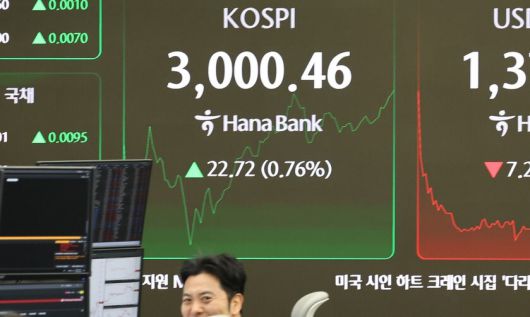 코스피가 장중 3000을 돌파한 20일 서울 중구 하나은행 딜링룸에서 딜러들이 활짝 웃고 있다. 연합뉴스 |