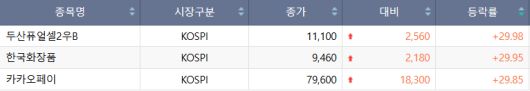 20일 코스피 시장에서 상한가를 기록한 종목은 두산퓨얼셀2우B(29.98%), 한국화장품(29.95%), 카카오페이(29.85%) 등 3종목이다. 하한가를 기록한 종목은 없었다.