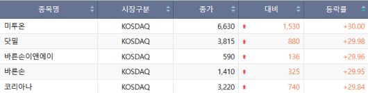 코스닥에서 상한가를 기록한 종목은 미투온(30.00%), 닷밀(29.98%), 바른손이앤에이(29.96%), 바른손(29.95%), 코리아나(29.84%) 등 5종목이다.