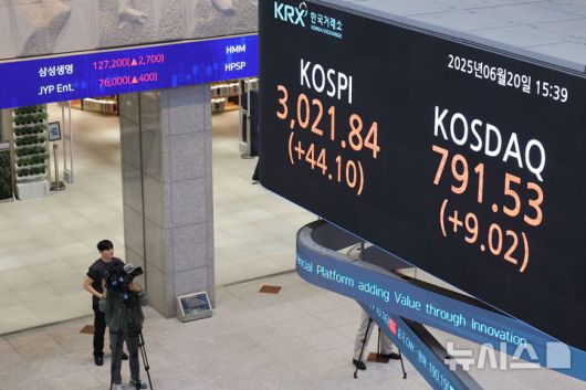 [서울=뉴시스] 권창회 기자 = 20일 오후 서울 여의도 한국거래소 서울사무소 마켓스퀘어에 지수가 표시돼 있다코스피가 전 거래일보다 44.1포인트(1.48%) 오른 3021.84에 마감했다. 코스피가 3000선에 오른 건 지난 2022년 1월 이후 3년 5개월여 만이다. 2025.06.20. kch0523@newsis.com |