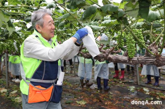 강호동 농협중앙회장이 20일 경기도 화성시 송산면 송산포도로 한 농가에서 봉사활동 중 포도 송이에 봉지를 씌우고 있다. 농협 제공 |