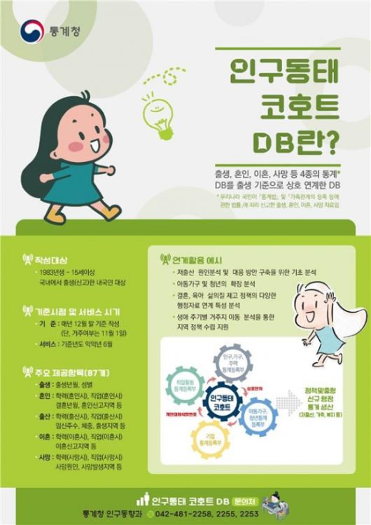 안형준 통계청 차장은 “인구동태 코호트 DB를 다른 행정자료와 연계하면 별도 조사 없이도 특정 코호트의 생애주기 변동과 사회·경제적 특성에 대한 추가 분석 등이 가능하다”면서 “데이터가 저출생, 청년 등 관련 정책 수립 시 활용되길 기대한다”고 말했다.