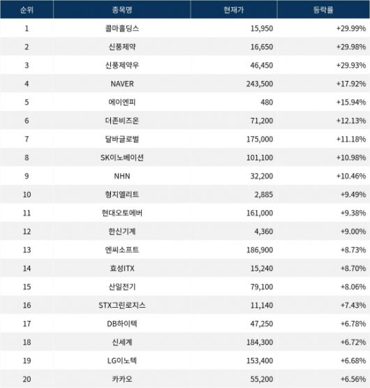 이어 상승률 2위 신풍제약(019170)은 주가가 29.98% 폭등하며 종가 16,650원에 상승 마감했다. 상승률 3위 신풍제약우(019175)의 주가는 46,450원으로 29.93% 폭등하며 강세를 보였다. 상승률 4위 NAVER(035420)는 17.92% 급등하며 243,500원에 마감했다. 상승률 5위 에이엔피(015260)는 15.94%의 급등세를 타고 종가 480원에 마감했다.