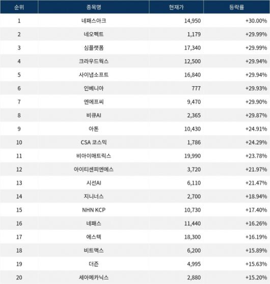 이어 상승률 2위 네오펙트(290660)는 주가가 29.99% 상승하며 종가 1,179원에 마감했다. 상승률 3위 심플랫폼(444530)의 주가는 17,340원으로 29.99% 상승했다. 상승률 4위 크라우드웍스(355390)는 29.94% 상승하며 12,500원에 마감했다. 상승률 5위 사이냅소프트(466410)는 29.94%의 상승세를 타고 종가 16,840원에 마감했다.
