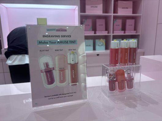 매장은 1층과 2층으로 구성돼 있다. 1층은 제품 중심의 공간이다. 어뮤즈의 대표 제품인 ‘젤핏 틴트’, ‘듀 틴트’, ‘세라믹 스킨 퍼펙터 쿠션’ 등 주요 상품이 비치돼 있고 테스트가 가능한 전용 뷰티 테이블도 곳곳에 마련돼 있다.