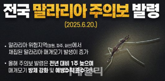 질병청은 ‘2025년 말라리아 매개모기 조사감시사업’을 통해 말라리아 위험지역(서울, 인천, 경기, 강원)의 매개모기 발생 양상을 매년 조사하고 있다. 말라리아 위험지역 내 69개 조사지점에서 24주차 매개모기 밀도 감시 결과, 하루 평균 한 대의 채집기에서 채집된 모기수가 0.5 이상인 감시 지점이 철원군(0.9)과 파주시(0.8), 화천군(0.6) 3곳으로 확인됐다. 말라리아 주의보 발령 기준은 매개모기 일평균 개체 수(TI)가 0.5 이상인 시·군·구가 3곳 이상인 경우다.