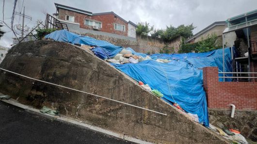 20일 찾은 서울 성북구 삼선동의 한 노후 주택가에서 붕괴한 옹벽이 복구되지 않은 채 방수포에 덮여있다. 최현수 기자 |
