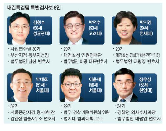 조 특검은 이날 언론 공지를 통해 특검보 6명의 명단이 확정됐다고 밝혔다. 조 특검과 함께 수사를 이끌 특검보 6명은 박억수 법무법인 이공 변호사(사법연수원 29기), 박지영 법무법인 태평양 변호사(29기), 이윤제 명지대 교수(29기), 김형수 법무법인 남산 변호사(30기), 박태호 김앤장 법률사무소 변호사(32기), 장우성 법무법인 태평양 변호사(34기)다. 경찰 출신인 장우성 특검보를 제외한 5명은 검사 출신이다. 조 특검은 "대한변호사협회 추천을 반영하고 수사 능력과 수사 관리 능력이 출중한 경찰 출신을 제청했다"고 밝혔다. 특검법상 임명 시한은 22일이었지만, 수사가 속도를 내면서 특검보 임명도 앞당겨졌다.