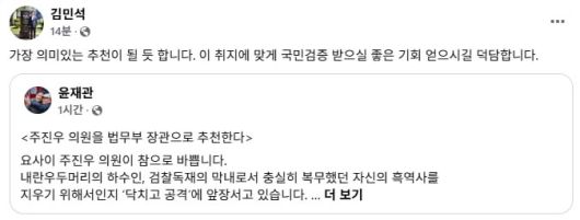 김민석 국무총리 후보자가 '국민의힘 주진우 의원을 법무부 장관으로 추천한다'는 제목의 조국혁신당 논평을 SNS에 공유했다 삭제했습니다.
