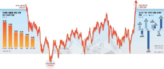 이재명 정부 출범 이후 관세 불확실성과 중동 불안을 넘어 코스피지수가 단기간 급등할 수 있었던 배경은 정치적 불확실성 해소, 자본시장 개혁안 추진 등이 투자자들에게 긍정적 평가를 받았기 때문으로 풀이된다. 조선·방산→지주사→저 주가순자산비율(PBR) 등 순환매 장세가 이어졌고 ‘바이 코리아’로 돌아선 외국인은 이달에만 4조 8142억 원어치를 사들이며 유동성을 공급했다. 다만 2400~2600 ‘박스피’를 뚫어낸 코스피가 3000이라는 상징적인 분기점을 넘어 추가적인 상승세를 이어가기 위해서는 기업들의 실적이 뒷받침돼야 한다는 진단이 나온다.