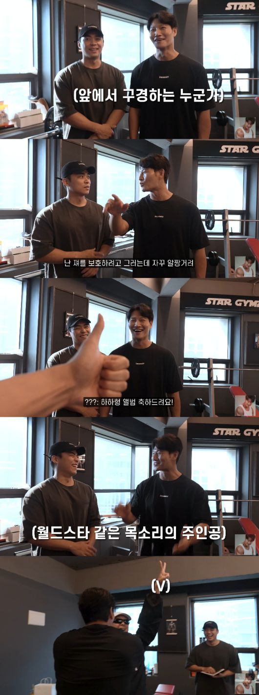 이후 헬스장에 도착한 하하는 뷔를 보고 깜짝 놀라 양손으로 'V'를 만들며 인사를 건넸고, 김종국이 제지했음에도 촬영 내내 뷔에게 눈을 못 떼는 모습을 보였다.