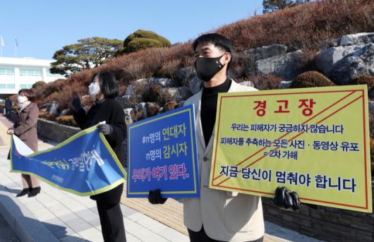 ▲2020년 12월 9일 이른바 '제2n번방'을 통해 미성년자 성 착취물을 제작·배포한 닉네임 '로리대장태범' 배모(18)군 등의 항소심 선고 공판이 열렸다. 강원 춘천지법 앞에서 디지털성폭력대응 강원미투행동연대 회원들이 재판부에 엄중 처벌을 촉구하고 있다. ⓒ연합뉴스 |