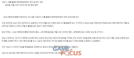 대한민국 게임산업의 메카로 자처하는 성남시가 AI활용 중독 예방 콘텐츠 공모전에서 게임을 알코올과, 약물, 도박과 함께 묶는 이른바 ‘4대 중독’으로 표현해 논란이다. 게임업계의 문제 제기 이후 성남시가 해당 공모전 내용을 수정했지만 해당 논란에 대해 별다른 해명과 사과를 하지 않은 채 모르쇠로 일관 하고 있어 논란이 더욱 증폭되는 모양새다.