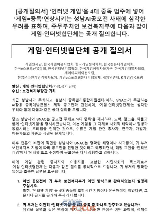 이러한 와중에 지난 19일, 게임산업협회를 비롯해 게임인재단, 한국게임이용자협회, 한국게임정책학회 등 13개 협단체가 보건복지부 장관을 대상으로 하는 공개 질의서를 공개했다. 공개 질의서의 내용은 일반인은 물론 우리가 물어보고 싶었던 한 마디로 등을 시원하게 긁어주는 질문들로 가득했다.