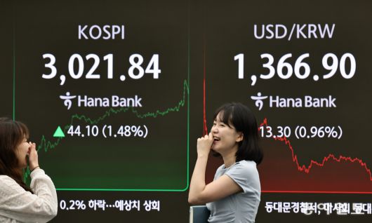 20일 서울 중구 하나은행 본사 딜링룸에 코스피 지수가 3000을 상회하는 숫자를 보이고 있다. 양회성 기자 yohan@donga.com |