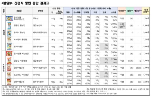 집에서 간편하게 즐길 수 있는 냉면 10종 가운데 9종이 하루 나트륨 섭취 기준의 절반을 초과하는 것으로 조사됐다. 일부 제품은 기준치를 훌쩍 넘어선 것으로 나타나 주의가 필요하다는 지적이다.