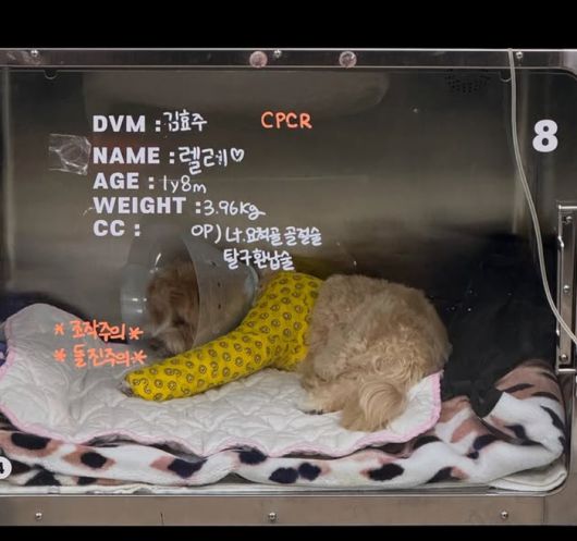 함께 공개된 사진에는 수술 후 입원실에서 깁스를 한 채 힘없이 누워있는 렐레의 모습이 담겨 안타까움을 자아낸다. 사진 속 입원실 정보판에는 ‘NAME: 렐레♡’라는 이름과 함께 ‘OP) 요척골 골절술, 탈구환납술’이라는 수술명이 적혀 있어 사고 당시의 심각성을 짐작게 한다.