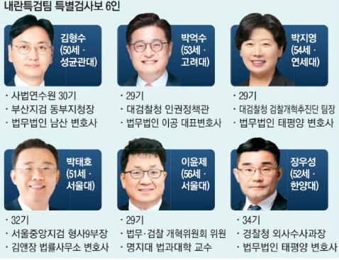 경찰 출신인 장 특검보를 제외한 5명은 검사 출신이다. 조 특검은 “대한변호사협회의 추천을 반영하고, 수사 능력과 수사 관리 능력이 출중한 경찰 출신을 제청했다”고 밝혔다. 특검법상 임명 시한은 22일이었지만, 수사가 속도를 내면서 특검보 임명도 앞당겨졌다.