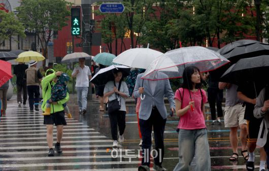 본격적인 장마가 시작, 서울에 호우주의보가 경기·인천에 호우경보가 발령된 20일 서울 세종대로사거리에서 우산을 쓴 시민들이 발걸음을 옮기고 있다. 신태현 기자 holjjak@ |