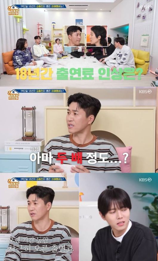 18년 동안 출연료가 얼마나 올랐냐는 질문에 김종민은 “처음에 얼마 받은지 잘 모르지만, 아마 두 배 정도 올랐을 거다. 시즌 바뀌면 멤버 바뀔 때마다 그에 맞춰서 인상을 해 주신다”고 답했다.