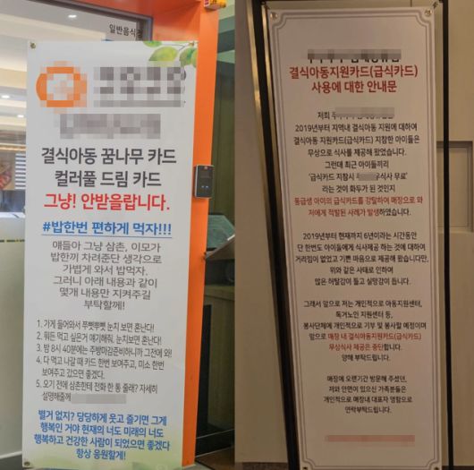 그러나 최근 ‘결식아동지원카드(급식카드) 사용에 대한 안내문’이라는 새 안내판을 걸고 종전 방침을 중단한다고 알렸다. ‘급식카드 지참 시 식사 무료’라는 사실이 알려지면서 동급생 아이의 급식카드를 뺏어 매장을 방문하는 사례가 적발됐기 때문이다.