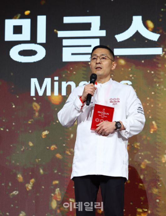 지난 2월 서울 중구 웨스틴조선호텔에서 열린 미쉐린 가이드 서울 & 부산 2025년 셀렉션 공개 행사에서 미쉐린 3스타로 승급된 한식당 밍글스의 강민구 셰프가 소감을 밝히고 있다. (사진=뉴시스) |