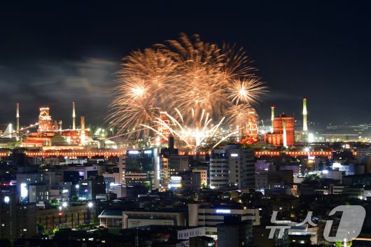 (포항=뉴스1) 최창호 기자 = 20일 경북 포항시 형산강 체육공원에서 열린 '2025 포항국제불빛축제'에서 데일리 불꽃쇼가 포스코 포항제철소를 배경으로 화려하게 펼쳐지고 있다. 2025.6.20/뉴스1