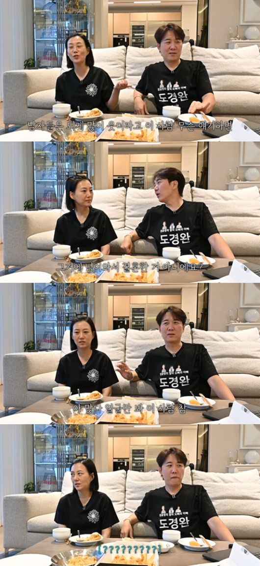 장윤정이 "남자들 중에 경완 씨 개그에 웃는 사람이 많다"라고 말했다. 이에 도경완은 "여자는 왜 (빼냐). 그거에 넘어와서 결혼한 거 아니냐"라고 물었다. 장윤정이 부인하자 도경완은 "아 맞다. 이 사람은 얼굴만 본다"라며 자부심을 표현했다.