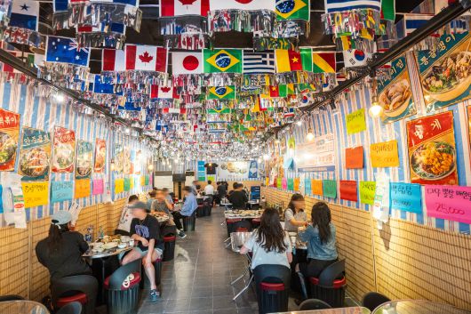 지난 17일 저녁 7시. 서울 영등포구 당산동에 있는 해산물 식당 ‘꺼꾸잽이 초장집’은 입구부터 알록달록한 천막으로 꾸며져 있었다. 가게 안으로 들어서자 드럼통 위에 은쟁반을 올린 듯한 철제 테이블과 동그란 의자가 놓여 있었고, 벽에는 알록달록한 천막과 대나무 발 위에 손으로 쓴 메뉴판이 붙어 있었다. 이곳은 ‘포장마차’를 콘셉트로 한 해산물 식당. 작년 11월 문 연 신상 맛집이지만 인테리어는 마치 추억 물씬한 포장마차처럼 꾸몄다. 1970~80년대식 길거리 포장마차에 익숙한 중장년층을 겨냥했다고 생각하면 오산. 손님 10명 중 9명은 20~40대 젊은 층이다.
