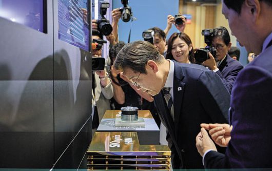 이재명 대통령이 20일 울산전시컨벤션센터에 마련된 SK하이닉스 부스에서 확대경을 통해 이 회사의 고대역폭 메모리(HBM) 제품을 보고 있다. AI 데이터센터의 두뇌 역할을 하는 반도체는 엔비디아가 만드는데, 그 핵심 부품 중 하나가 HBM이다. /대통령실 |