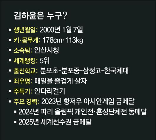여자 최중량급에서 금메달이 나온 건 1991년 스페인 바르셀로나 대회 문지윤(당시 72kg 초과급) 이후 처음이다. 한국 유도에서 여자 78kg 초과급은 불모지나 다름없었다. 올림픽에서 단 한 번도 금메달을 따지 못했고, 세계선수권에서도 그동안 34년간 우승자가 없었다. 김하윤은 이런 척박한 현실에서 한국 여자 유도의 희망으로 떠올랐다. 2023년 항저우 아시안게임에서 이 체급 역사상 처음으로 금메달을 따내며 한국 유도를 ‘노 골드’ 위기에서 구했고, 지난해 파리 올림픽 개인전, 혼성단체전 동메달을 목에 걸었다.