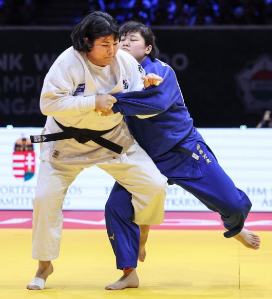 김하윤(왼쪽)이 20일 헝가리 부다페스트에서 열린 국제유도연맹(IJF) 세계선수권대회 여자 최중량급(78kg 초과급) 결승전에서 일본 아라이 마오에게 발기술을 시도하고 있다. 김하윤은 세계선수권 이 체급에서 한국 선수로는 1991년 문지윤 이후 34년 만에 정상에 섰다. 사진 출처 IJF 홈페이지 |