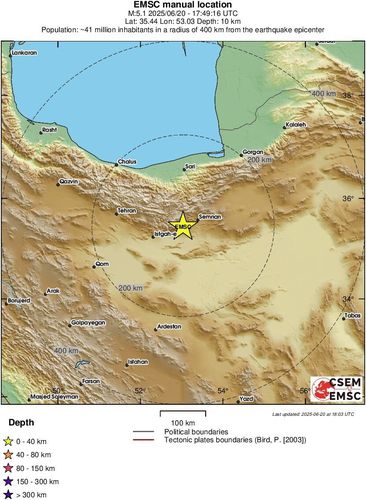 진앙은 북위 35.38도, 동경 53.07도이며 진원 깊이는 10㎞다. 수도 테헤란에서는 동쪽으로 약 140㎞ 떨어진 곳이다. 유럽지중해지진센터(EMSC)도 이번 지진 규모를 5.1로 평가했다.
