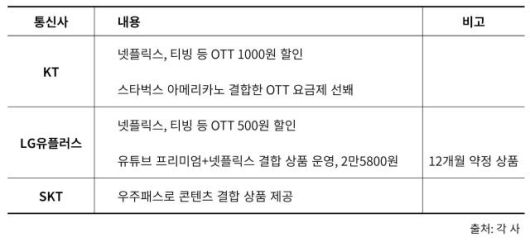 이에 통신사들은 자사 요금제에 OTT를 결합한 상품을 내놓거나, 부가서비스 가입을 유도해 가격 부담을 낮추려는 고객 수요를 공략하고 있다. 통신사별로 제공하는 OTT 부가서비스의 할인율은 다소 차이가 있으며 일부 상품은 번들 서비스로 구성해 가격 경쟁력을 높이고 있다.