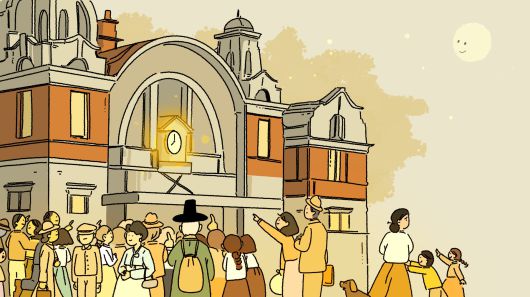 구 서울역(현 문화역서울 284) 대합실 입구에 설치된 대형 시계는 단골 약속 장소이자 랜드마크였다. 1925년 경성역 개업과 함께 선보인 이 시계는 열차 출도착 시간을 알리는 도구이자 시간 엄수라는 근대적 규율을 강제하는 장치였다./일러스트=조선디자인랩 이연주 |