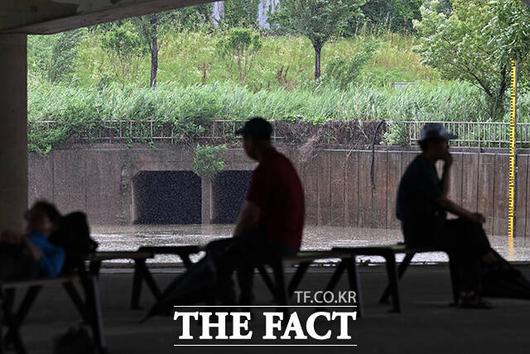 20일 오전 시민들이 서울 양천교 아래에서 비를 피하고 있다. /이새롬 기자 |