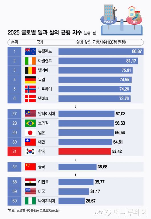 한국이 '2025 글로벌 일과 삶의 균형 지수' 조사에서 60개국 중 31위를 차지했다. /그래픽=윤선정 디자인기자 |