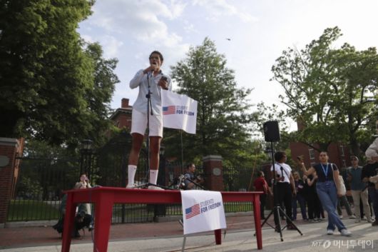 [케임브리지=AP/뉴시스] 27일(현지 시간) 미 매사추세츠주 케임브리지의 하버드대학교 사이언스센터 광장에서 2026년 졸업 예정자인 누리엘 베라-디그레프가 도널드 트럼프 대통령의 최근 하버드 제재에 반대하며 발언하고 있다. 2025.05.28. /사진=민경찬 |