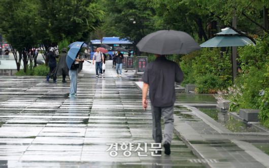 수도권에 본격적인 장마가 시작된 20일 시민들이 우산을 쓴 채 서울 종로구 광화문광장 일대를 걸어가고 있다. 권도현 기자 |
