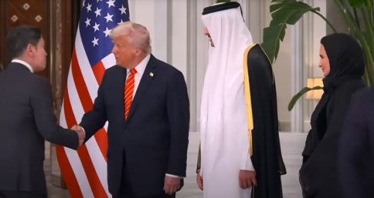 정용진(왼쪽) 신세계그룹 회장이 5월 14일 카타르 도하에서 셰이크 타밈 빈 하마드 알사니 카타르 국왕(에미르)이 주최한 트럼프 대통령과의 만찬에 참석하고 있다. 로이터 유튜브 라이브 캡쳐 |
