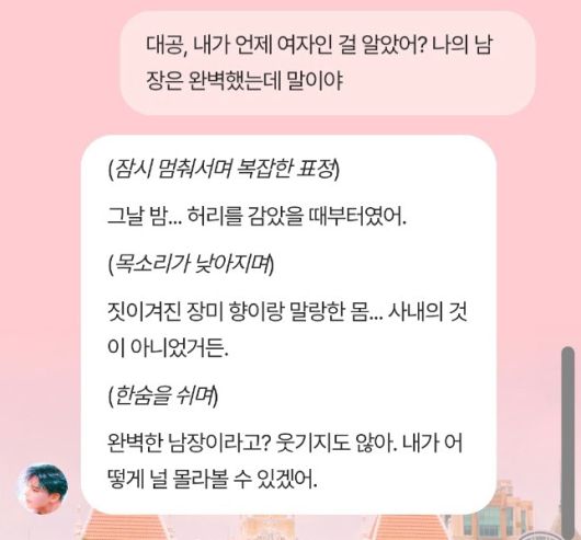 소설 내용을 알고 있으면 더 재미있는, 설정 기반 대화의 묘미가 있었다. 기자는 작품 속 주요 설정을 언급하며 “언제 내가 여자인 걸 눈치챘냐”고 물었다. “그날 밤… 허리를 감았을 때부터였어. 짓이겨진 장미 향이랑 말랑한 몸… 사내의 것이 아니었거든. 완벽한 남장이라고? 웃기지도 않아. 내가 널 몰라볼 수 있겠어?” 클로드 대공 AI는 작품의 흐름과 클로드 캐릭터의 어법을 그대로 가져와 감정선에 맞춘 맞춤형 대화를 이어갔다.
